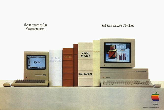 Pendant très longtemps la pomme croquée a été segmentée par les couleurs de l’arc en ciel. Disparues du logo qui a été simplifié, on les retrouve aujourd’hui dans la communication de l’ipod par exemple. Ces couleurs sont chaudes et humaines elles aussi, elles sont toujours d’actualité. En fait elles sont mêmes toniques ou acidulées selon qu’on les utilise seules.